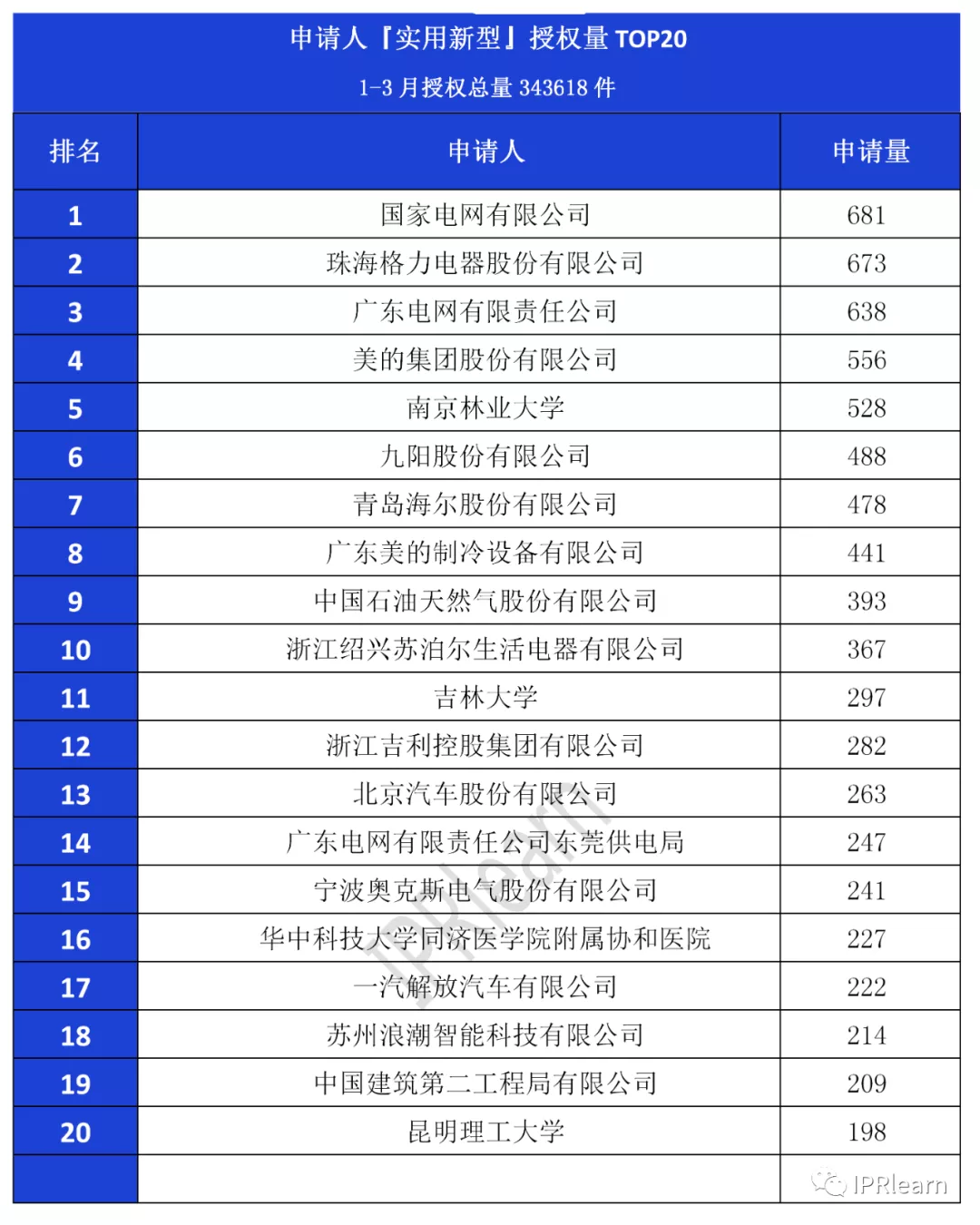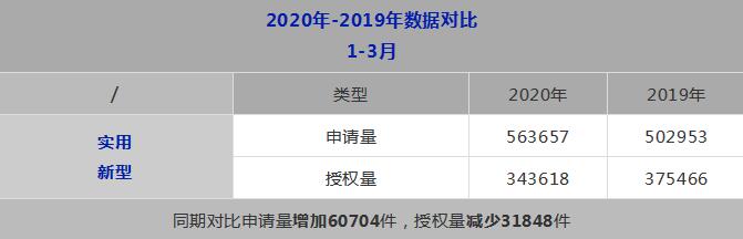 1-3 月,我國實(shí)用新型專利申請 56.4 萬件,實(shí)用新型專利授權(quán) 34.4 萬件。截至 2020 年 3 月底,實(shí)用新型專利有效 量為 545.2 萬件。