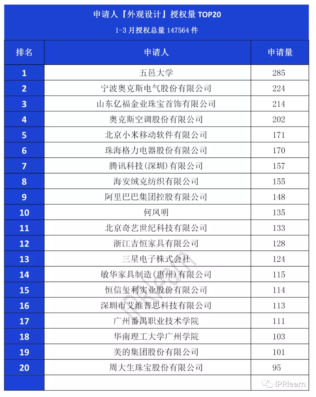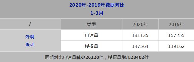 1-3 月,我國外觀設(shè)計(jì)專利申請 13.1 萬件,外觀設(shè)計(jì)專利授權(quán) 14.8 萬件。截至 2020 年 3 月底,外觀設(shè)計(jì)專利有效 量為 186.9 萬件。