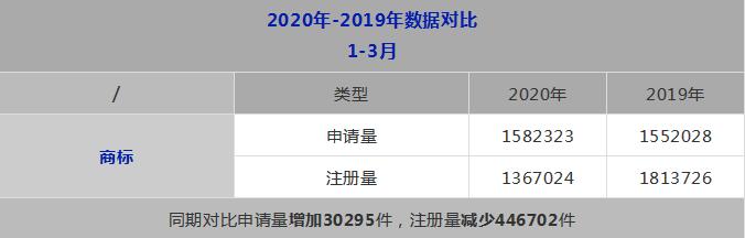 2020 年 1-3 月,我國商標(biāo)申請量為 158.2 萬件,商標(biāo)注冊量為 136.7 萬件。截至 2020 年 3 月底,有效注冊商標(biāo)量 2638.2 萬件。