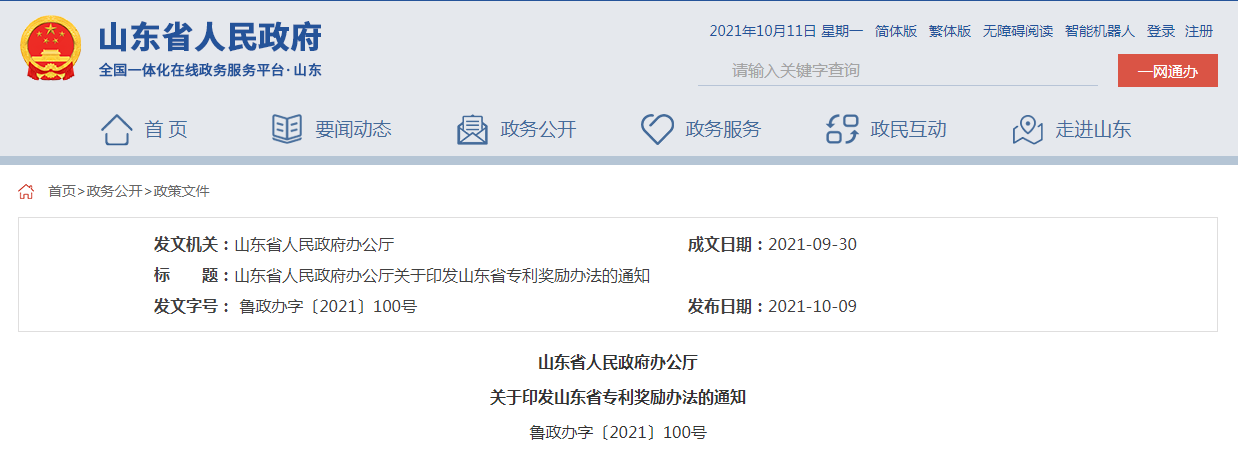 10月9日,山東省人民政府網(wǎng)站發(fā)布《山東省人民政府辦公廳關(guān)于印發(fā)山東省專利獎(jiǎng)勵(lì)辦法的通知》(魯政辦字〔2021〕100號),全文如下: